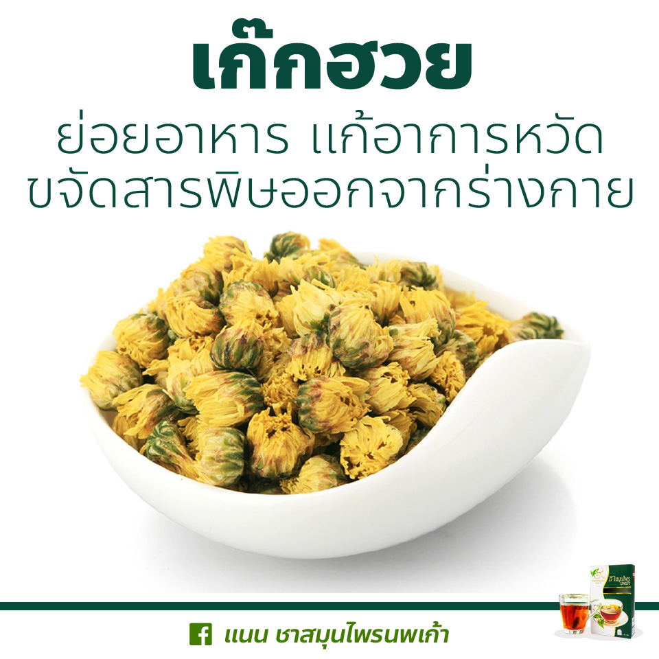 เก๊กฮวย (Chrysanthemum) มีสารพวกฟลาโวนอยด์ สารไครแซนทีมิน เก็กฮวยช่วยขับเหงื่อและกำจัดสารพิษออกจากร่างกาย ช่วยระบายและย่อยอาหาร